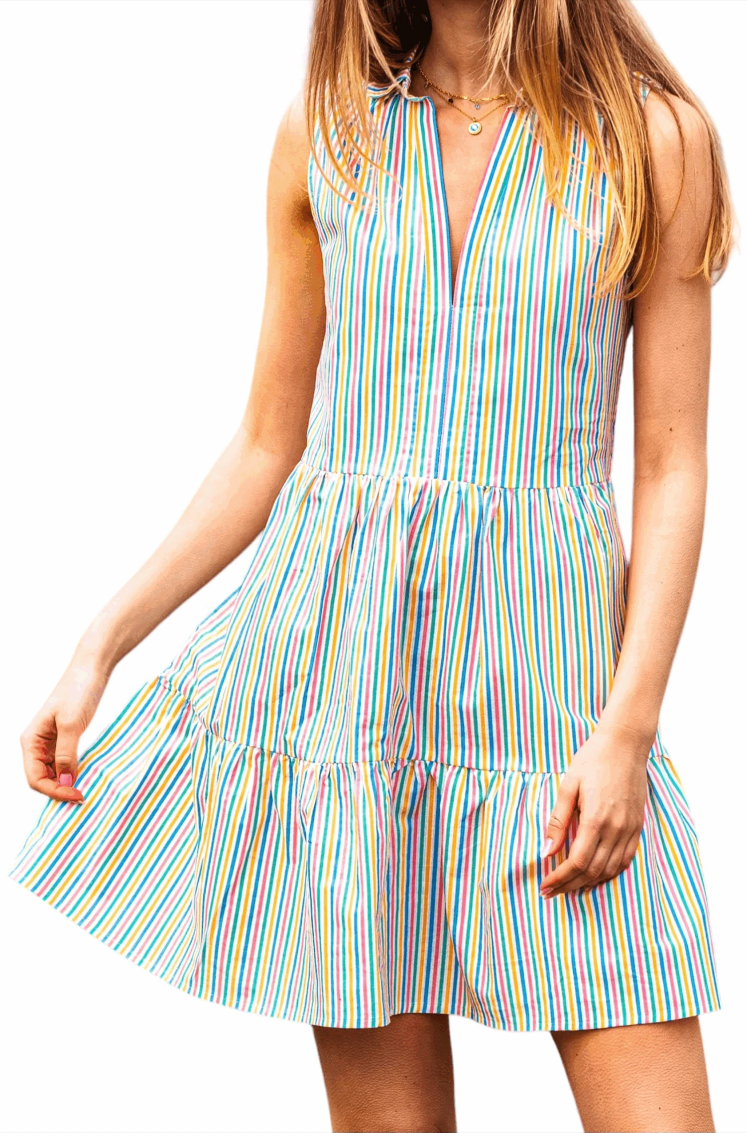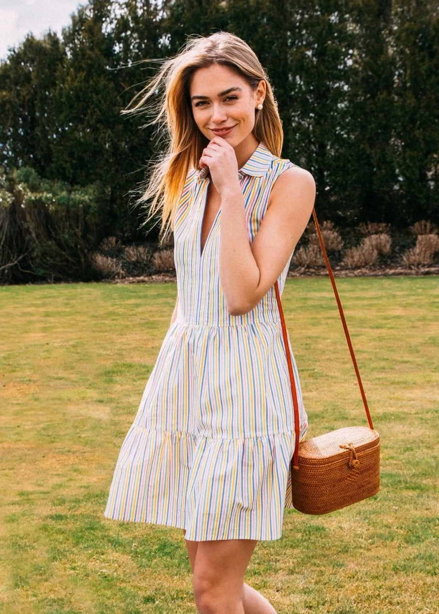 Timeless style meets comfort in our latest women’s dress silhouette. A split neckline and colorful stripes add an effortless elegance to this staple piece that can be worn on beach vacations, garden parties, and beyond.