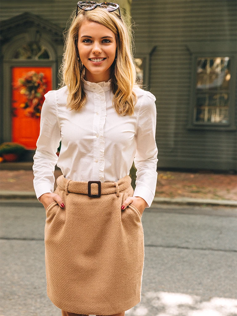 A fresh take on the classic women’s oxford–this ruffle front shirt adds a festive flair to any ensemble.