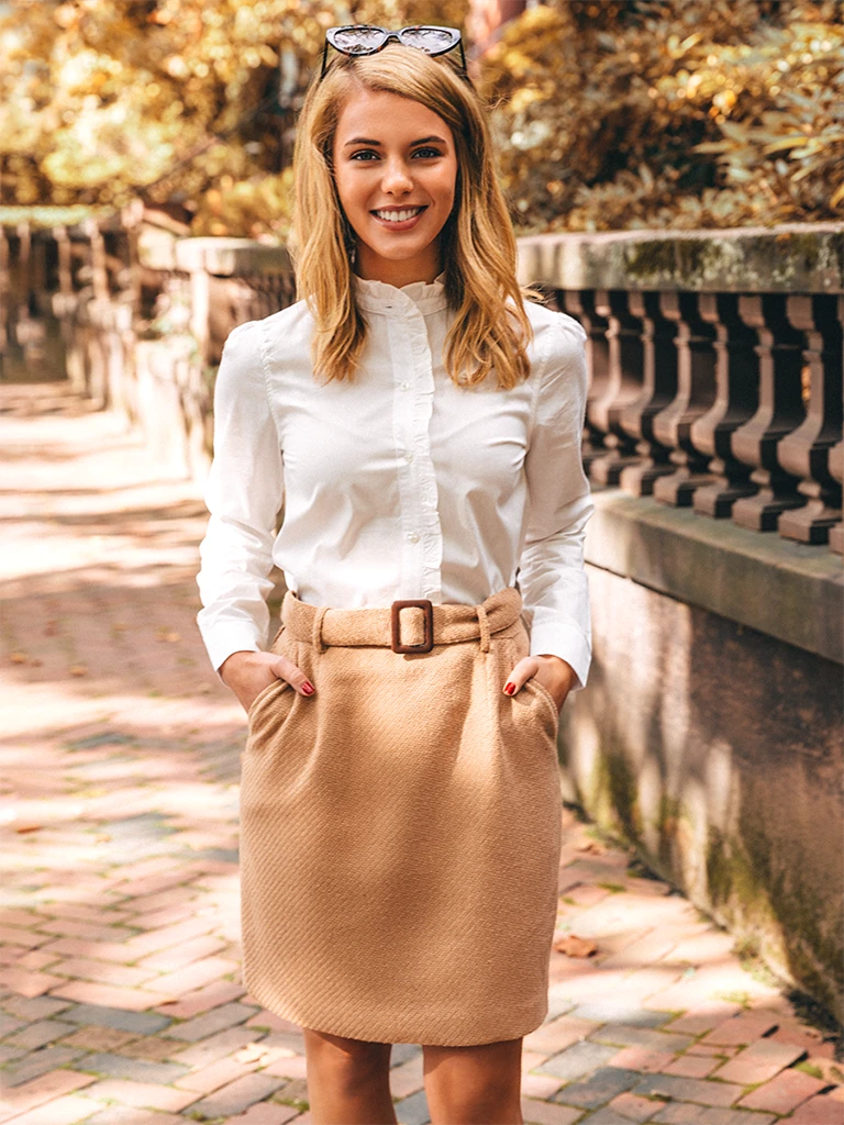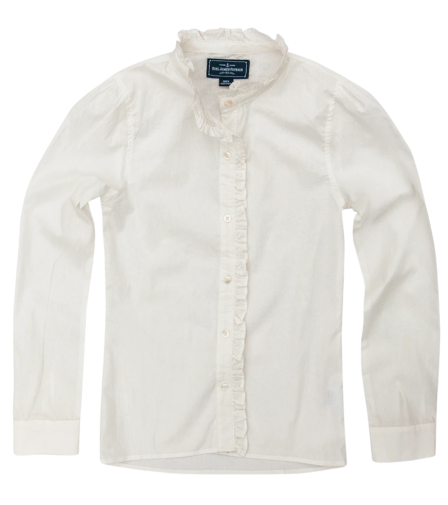 - Ruffled placket and collar