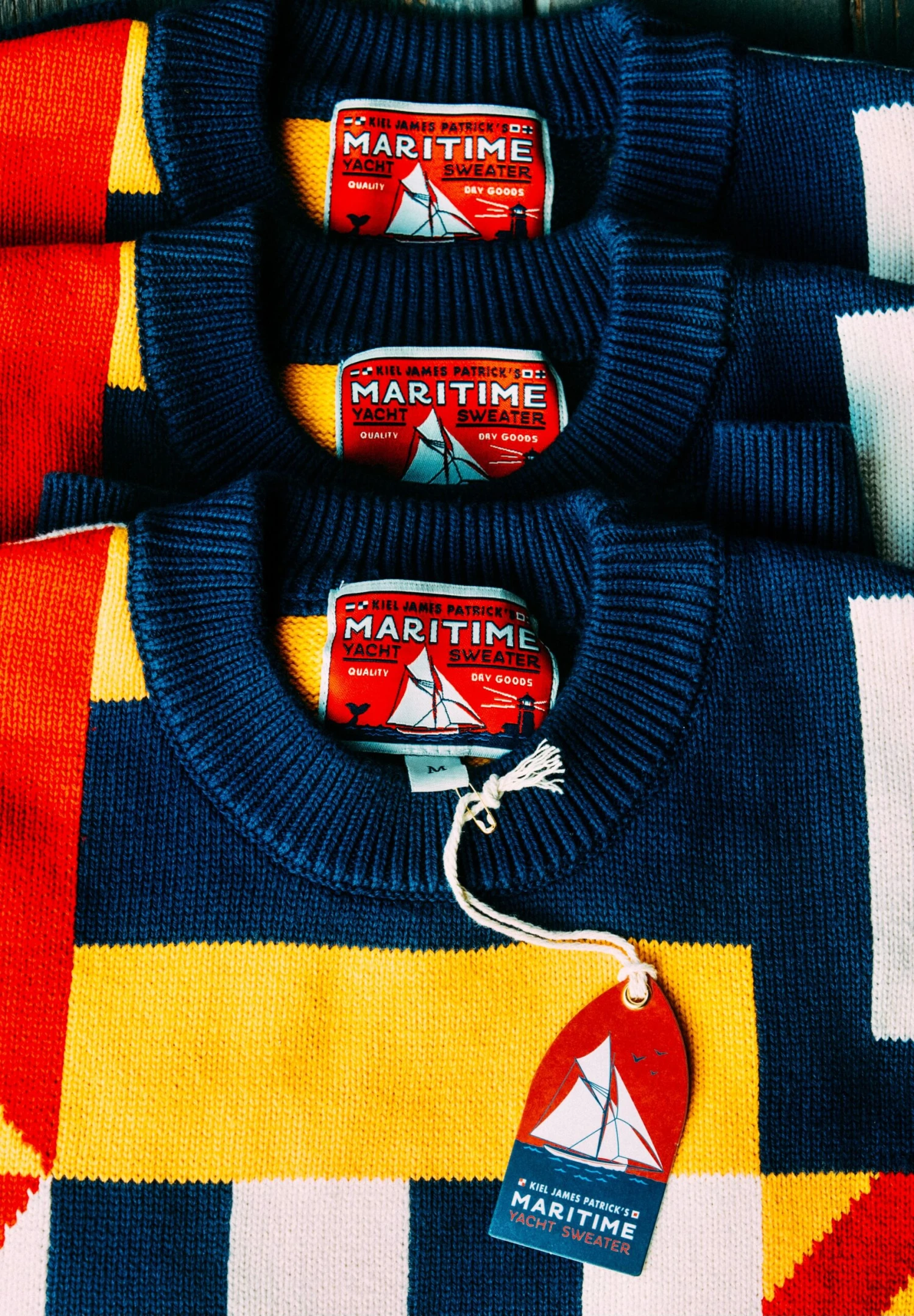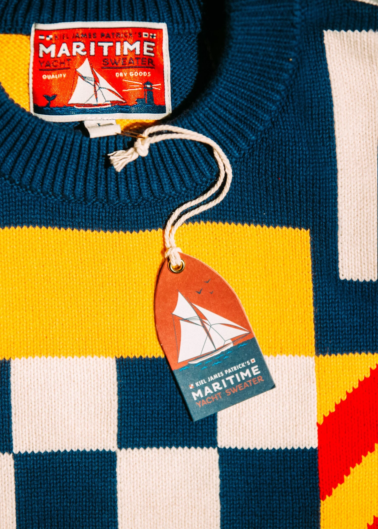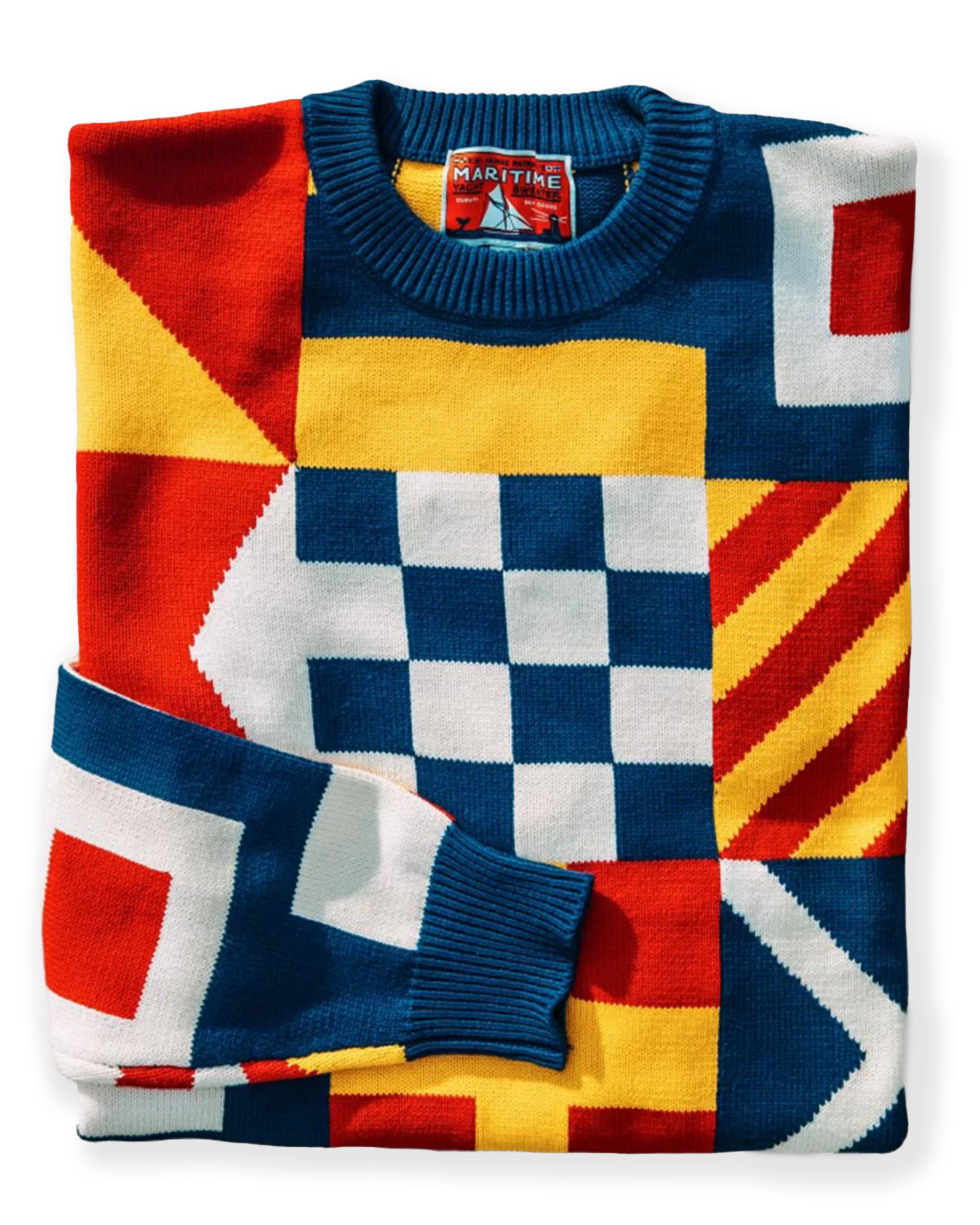 The Maritime Sweater is a work of art, crafted entirely from panels of nautical flags knit together in a seamless tapestry of color that pays homage to the seafaring heritage of New England. Lightweight and perfect for warm summer days on the open sea, this rugged and dependable garment is a timeless companion for any voyage.